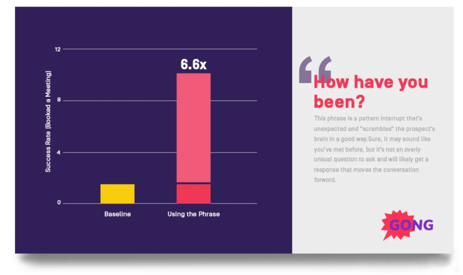 그렇지만, Gong.io가 90,380건의 콜드 콜 통계를 분석해보니, “어떻게 지내셨나요?”라는 오프닝 멘트가 다른 모든 오프닝 멘트 대비 더 나은 성과를 거두었습니다.