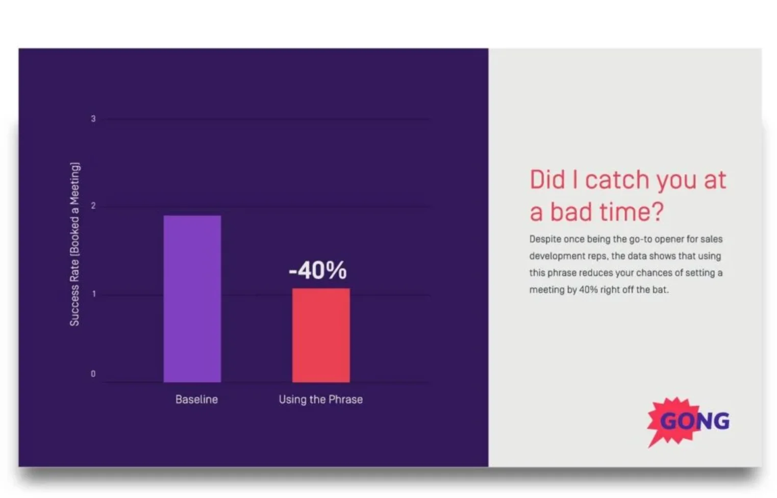 Gong.io의 데이터에 따르면 현실은 이렇습니다. “지금 잠깐 통화 가능하실까요?”로 콜드 콜을 시작하면, 미팅 예약 가능성이 40%나 낮아집니다.