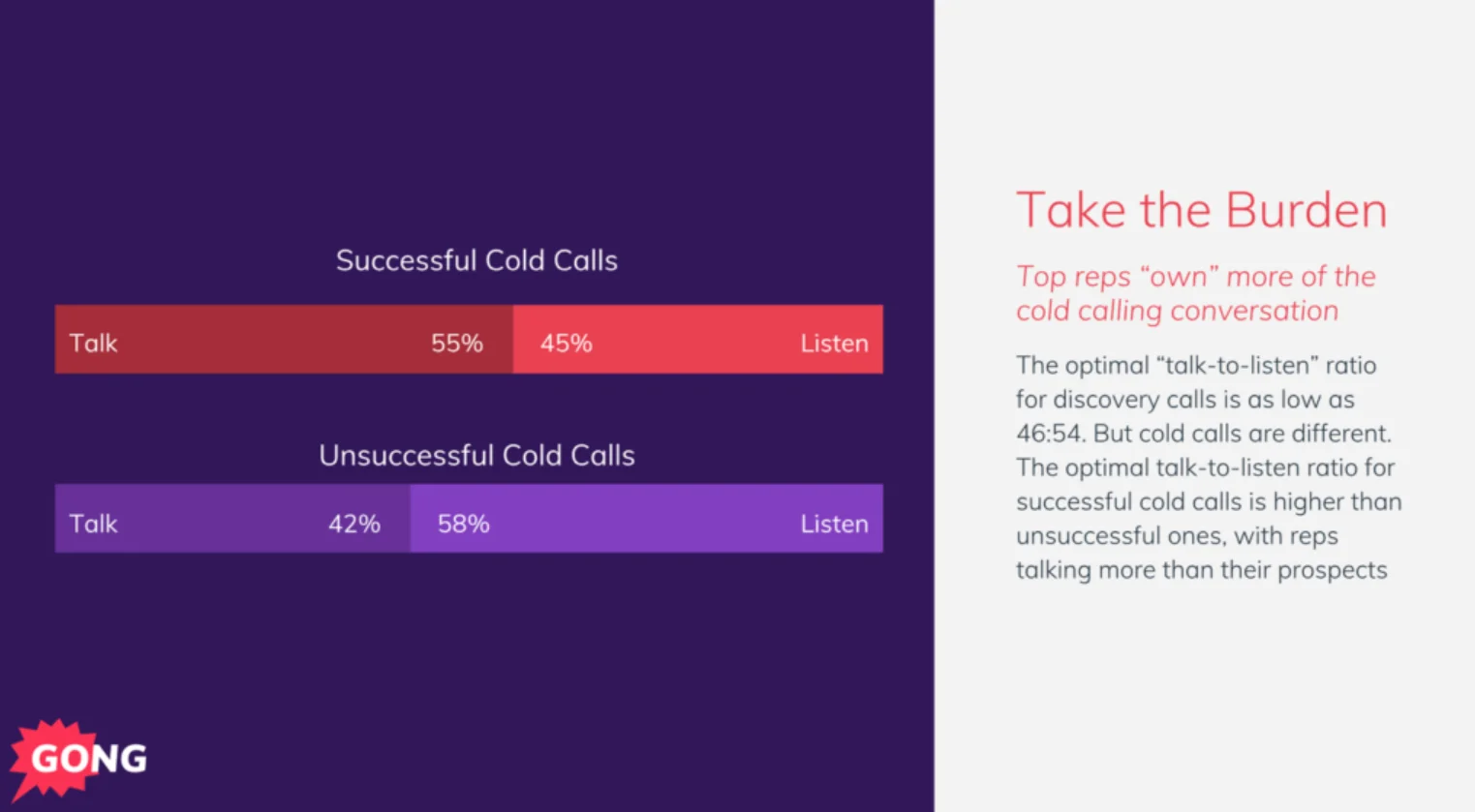 Gong.io의 데이터에 따르면, 성공적인 콜드 콜의 세일즈맨 / 고객 발화 비율은 아래와 같습니다.