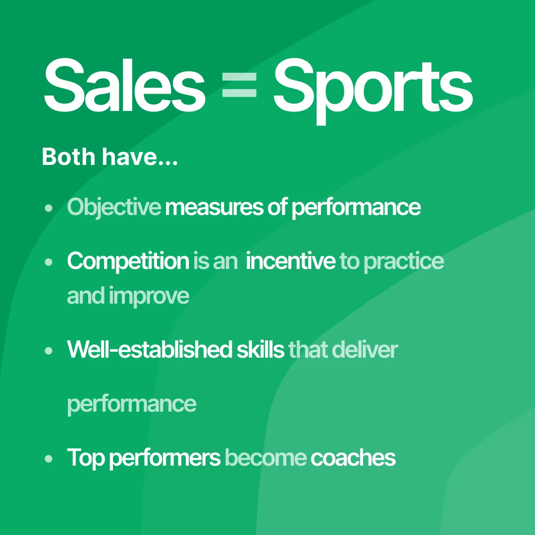 세일즈는 스포츠처럼 코칭하고 개선할 수 있는 몇 안 되는 비즈니스 영역 중 하나로, 스포츠와 비교하면 다음과 같은 공통점을 가지고 있습니다.