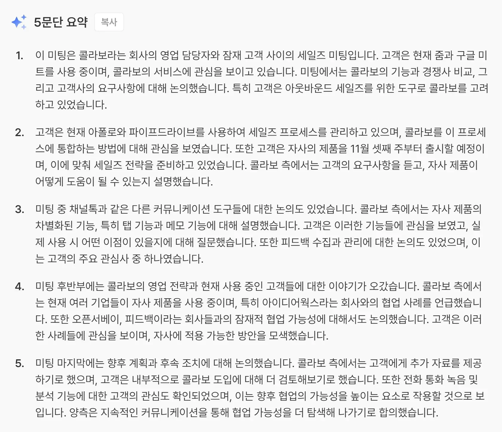 반면 콜라보는 문단별 요약을 통해 미팅의 전체적인 흐름을 더 정확하게 전달합니다. 미팅에 참석하지 않은 사람도 빠르게 미팅 내용을 확인해 업무 흐름을 놓치지 않게 만드는 것이 중요하다는 제품 철학에 기반하죠.
