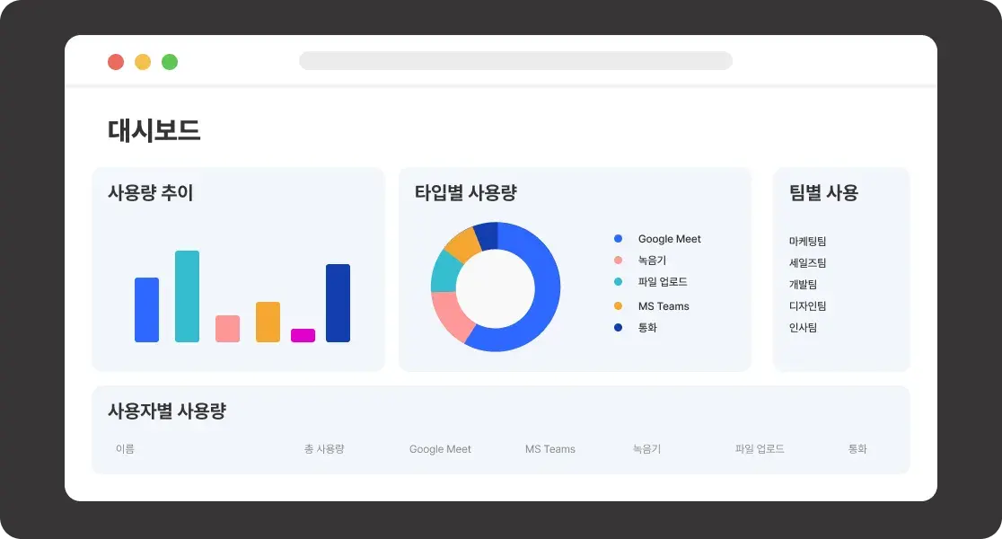 어떤 유저가 얼마나 미팅을 기록하고 있는지, 어떤 형태로 사용하고 있는지 한 눈에 볼 수 있는 대시보드가 추가되었습니다. 이제 콜라보를 통해 얼마나 많은 미팅이 데이터 자산으로 남고 있는지 확인하실 수 있습니다.