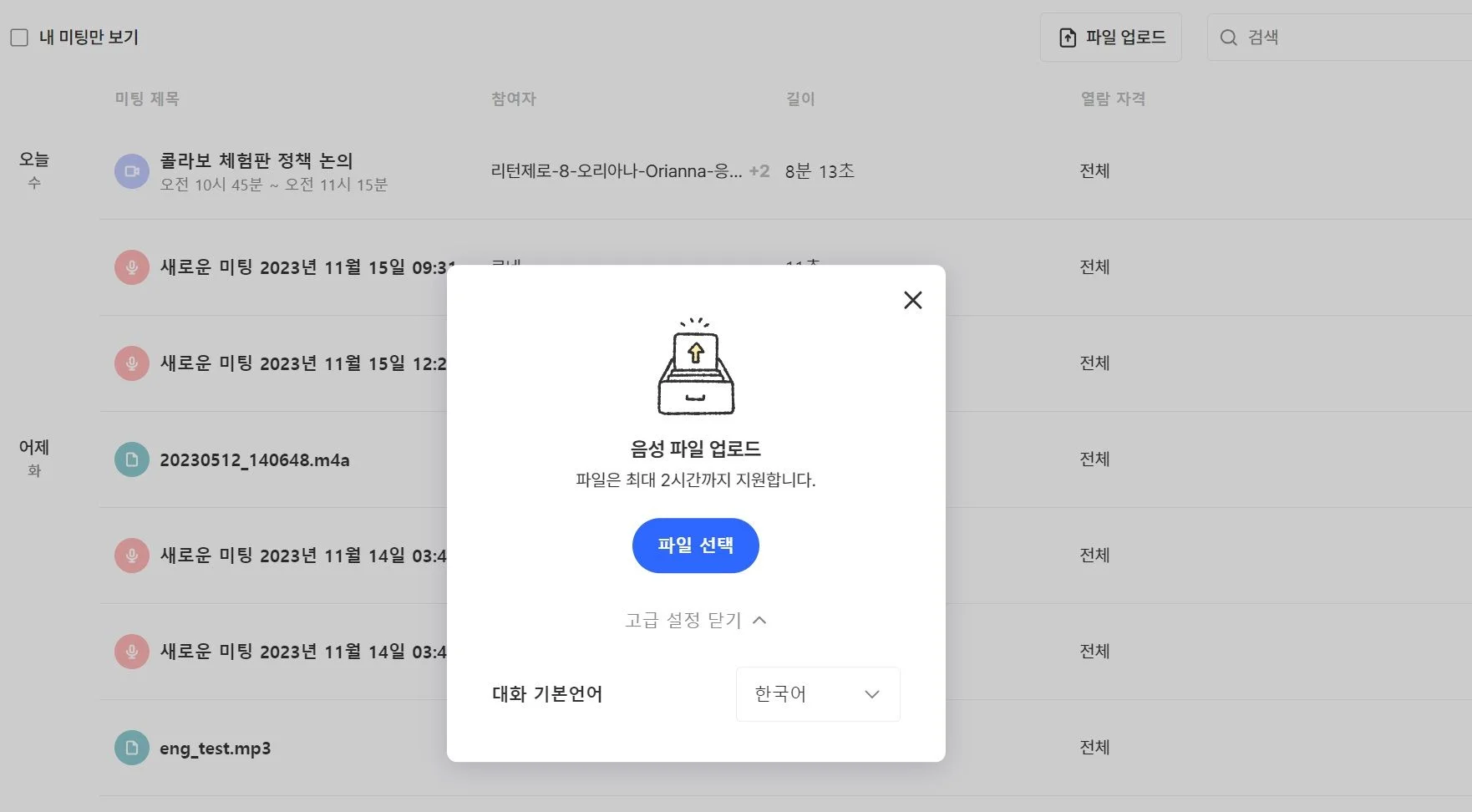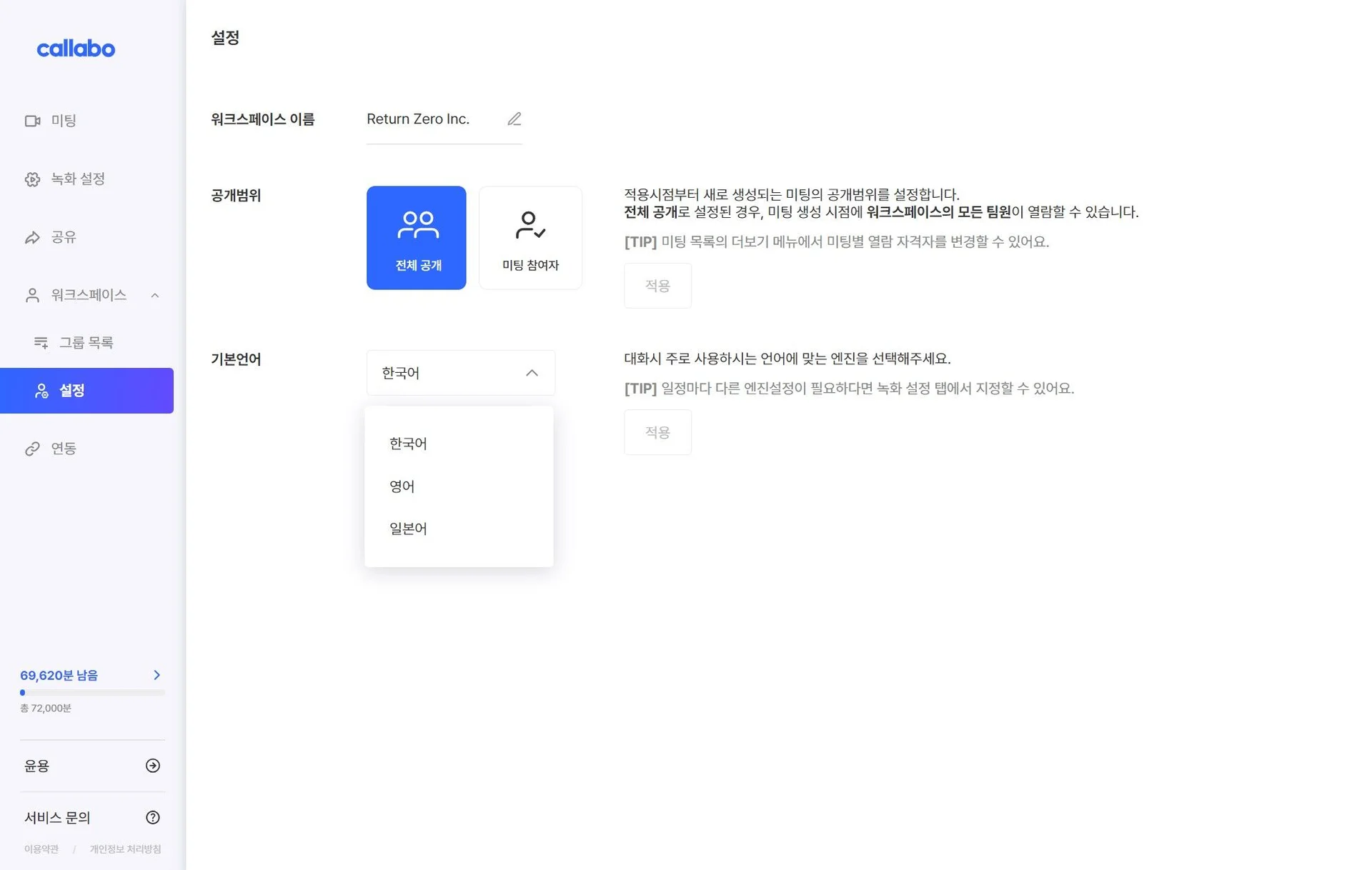 워크스페이스 단위로, 해당 워크스페이스에 저장되는 미팅의 텍스트 언어를 설정할 수 있습니다.