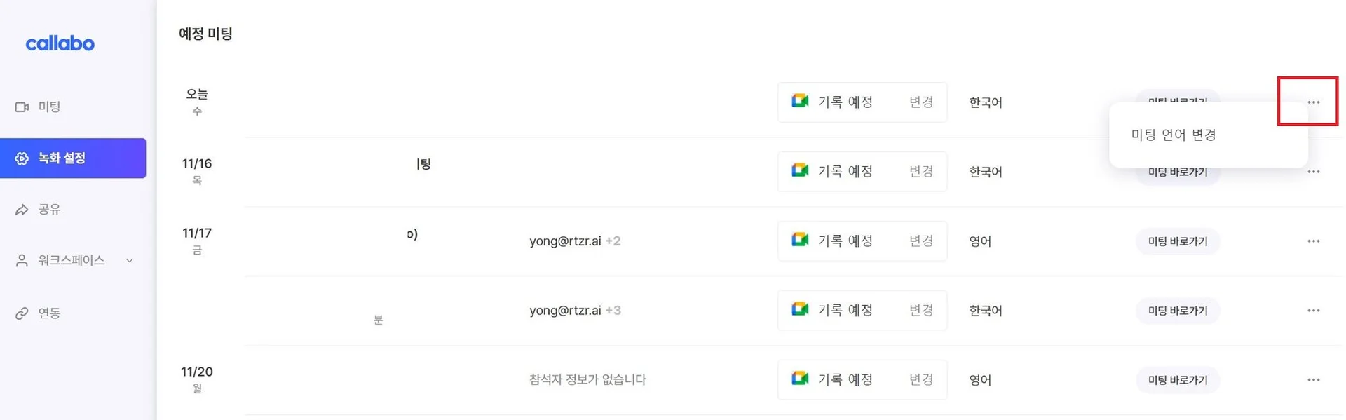 해당 워크스페이스에서 영어로 진행되는 미팅이 있다면 해당 미팅의 언어를 '영어'로 변경하여 영문 텍스트 변환 및 저장 가능
