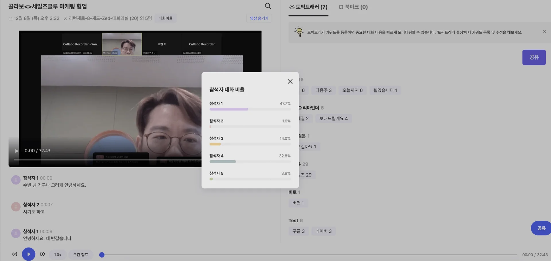 미팅을 콜라보로 녹취하면 발화 비율이 나오는데요. 최대한 고객 말을 많이 듣는 것이 중요하기 때문에 (우리가 컨설팅하듯 진행하는 미팅이 아닌 이상) ‘고객사:우리팀 발화 비율이 6:4 를 넘어가지 않도록’ 유념하며 미팅을 준비합니다.