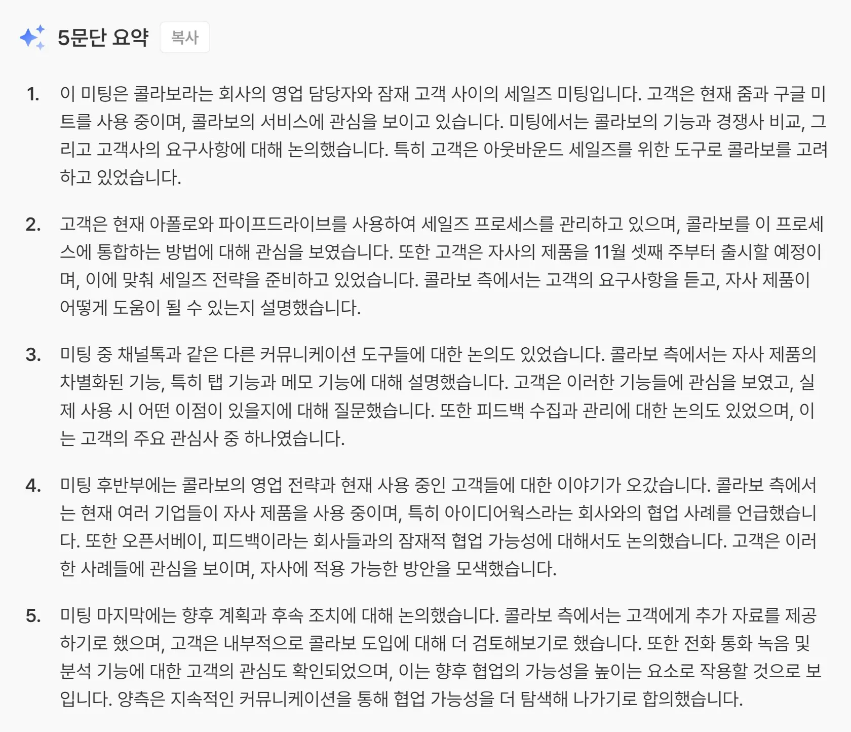 콜라보팀에서 Claude를 활용하는 가장 좋은 사례는 콜라보 제품 자체에 Claude LLM을 통합한 것입니다. 콜라보에 미팅이나 통화가 업로드되면 Claude가 자동으로 회의록을 작성해주는데, 이 때 한국어 맥락 이해도가 현존하는 LLM 중 가장 뛰어나다는 강점이 빛을 발합니다.
