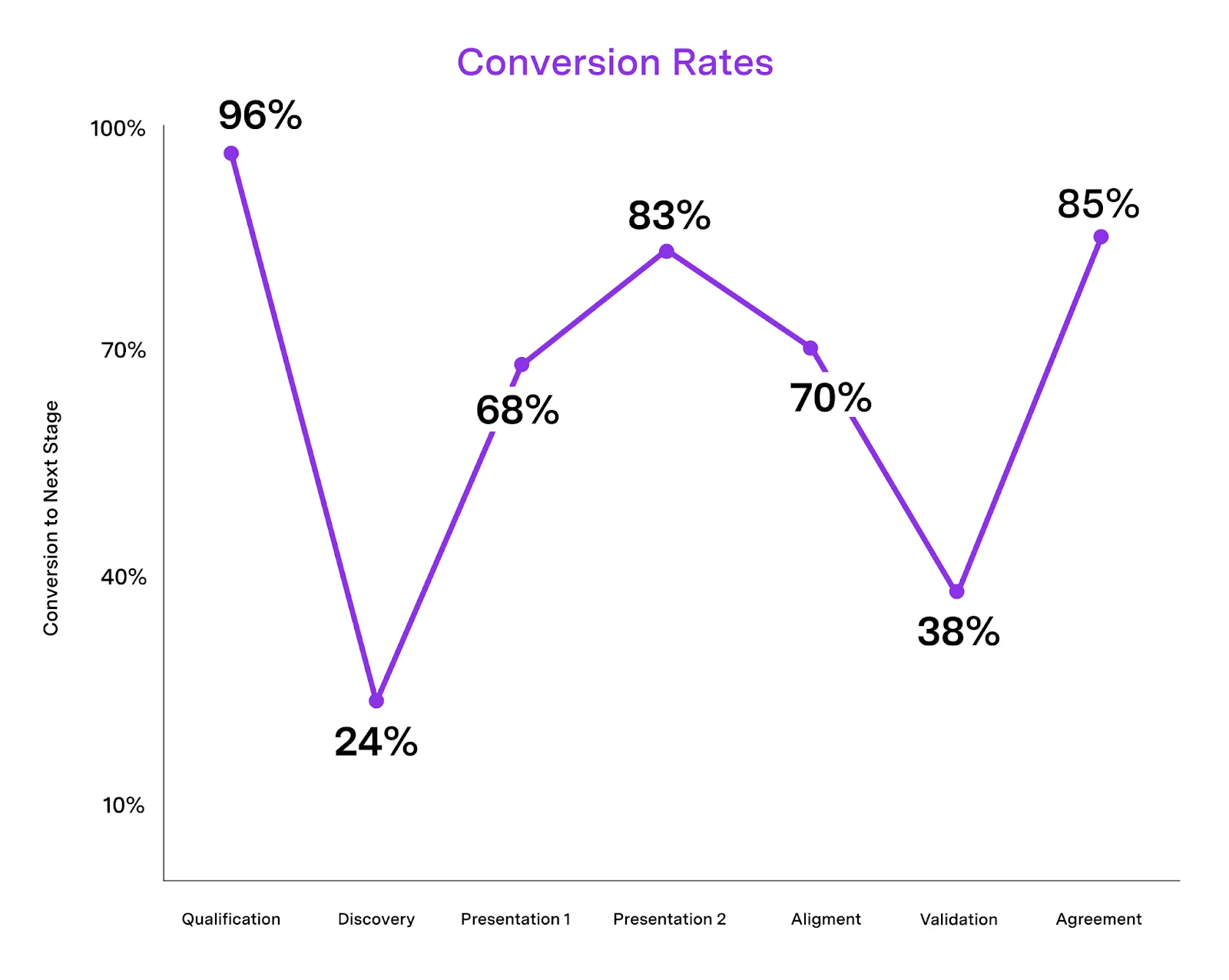 위 예시에서는 디스커버리 단계가 전환율을 떨어뜨리고 있으며 이를 최적화해야 한다는 것을 명확하게 알 수 있습니다. 발견 단계에서 전환율이 24%에 불과하다면 이 단계에서 76%의 잠재 고객을 놓치고 있다는 말이고, 이는 세일즈가 지속 불가능한 수준이죠.
