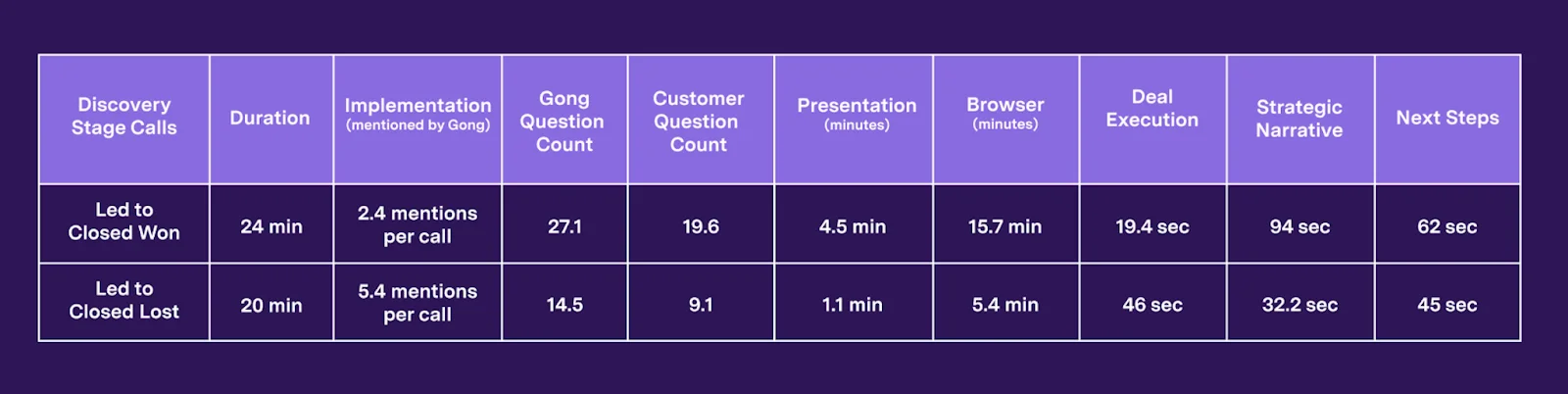 예를 들어, 'Duration'은 디스커버리 콜의 평균 길이를 나타냅니다. "Implementation"은 세일즈맨이 제품을 구현하는 방법에 대해 논의하는 것을 의미합니다. 논의하기에 좋은 주제이지만 세일즈 프로세스에서 적절한 타이밍은 아닐 수 있습니다. "프레젠테이션"은 세일즈맨이 디스커버리 콜에서 얼마나 많은 프레젠테이션을 했는지 등을 나타냅니다.