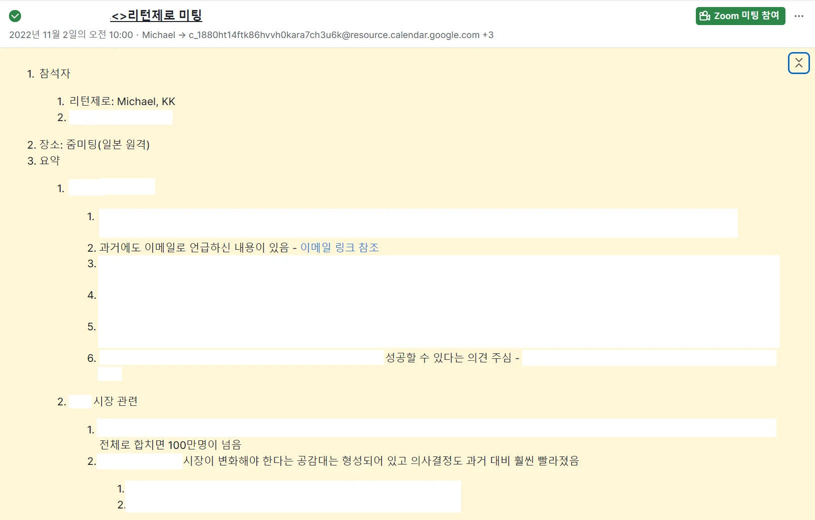 그리고 바로 딜을 만들기 위해서 시도를 해볼지 결정을 논의하는 내부미팅을 진행해서 일단 테스트부터 진행하기로 결정했습니다. 테스트 결과가 나쁘지 않으면 본격적으로 프로젝트에 리소스를 투입해보자 라는 플로우로 진행되었습니다.