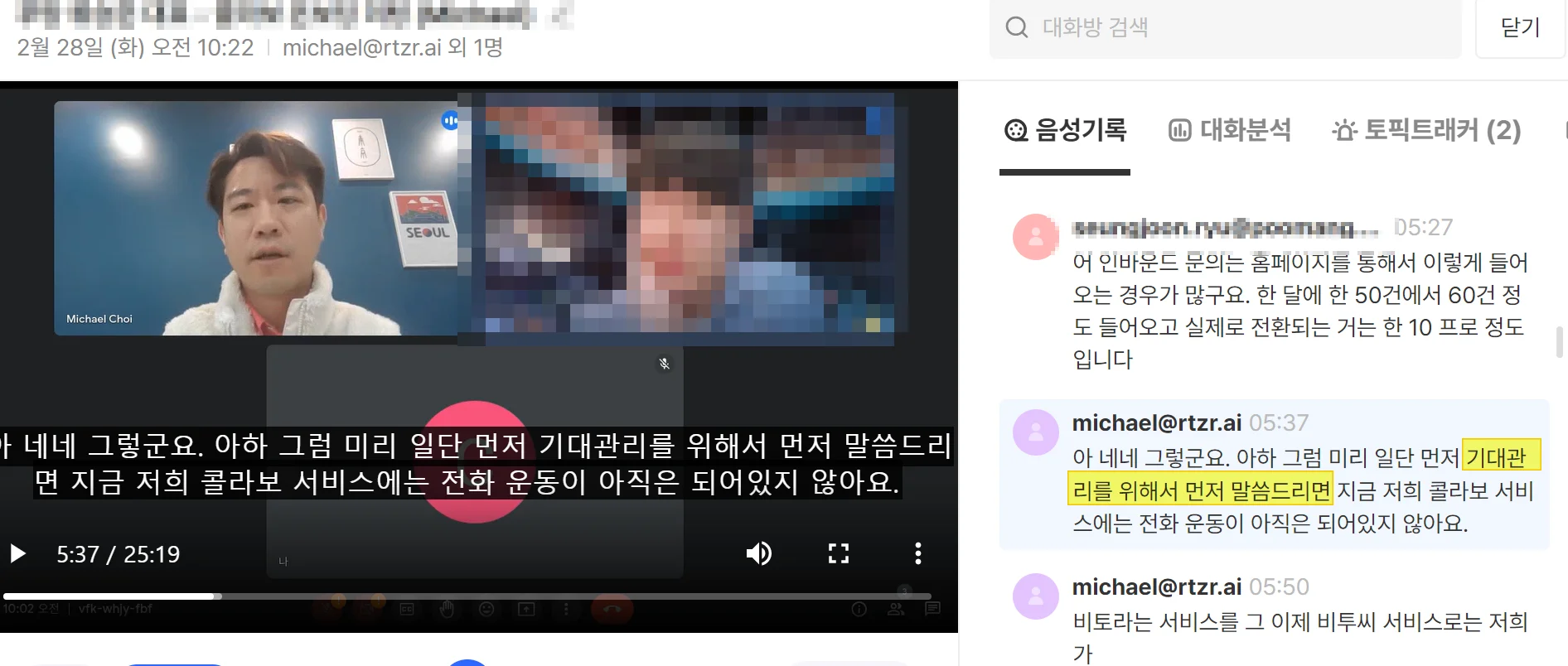 스스로 판단하기 어려운 경우는, 영업팀 내의 상호 피드백을 통해 기대관리 역량을 점검하고 향상시키는 것도 좋은 방법입니다. 함께 미팅에 참석한 영업팀 동료들과 콜라보를 통해 기록된 내용들을 리뷰 하여 팀 내 피드백을 듣는 문화를 만들어 봅시다. 여러분의 영업 스킬 향상에 큰 도움이 될 겁니다.