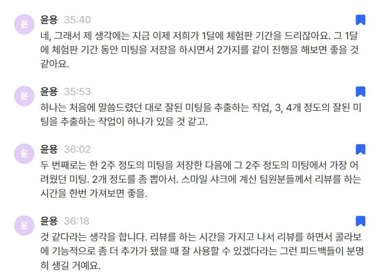 체험판 기간 동안 콜라보로 저장된 미팅 중 성공적이라고 판단하는 미팅 3~4개 추출해보기, 반대로 어렵고 개선이 필요하다고 생각하는 미팅 2~3개를 리뷰하는 시간 가져보기로 2가지 미션을 고객에게 던져 주었습니다.