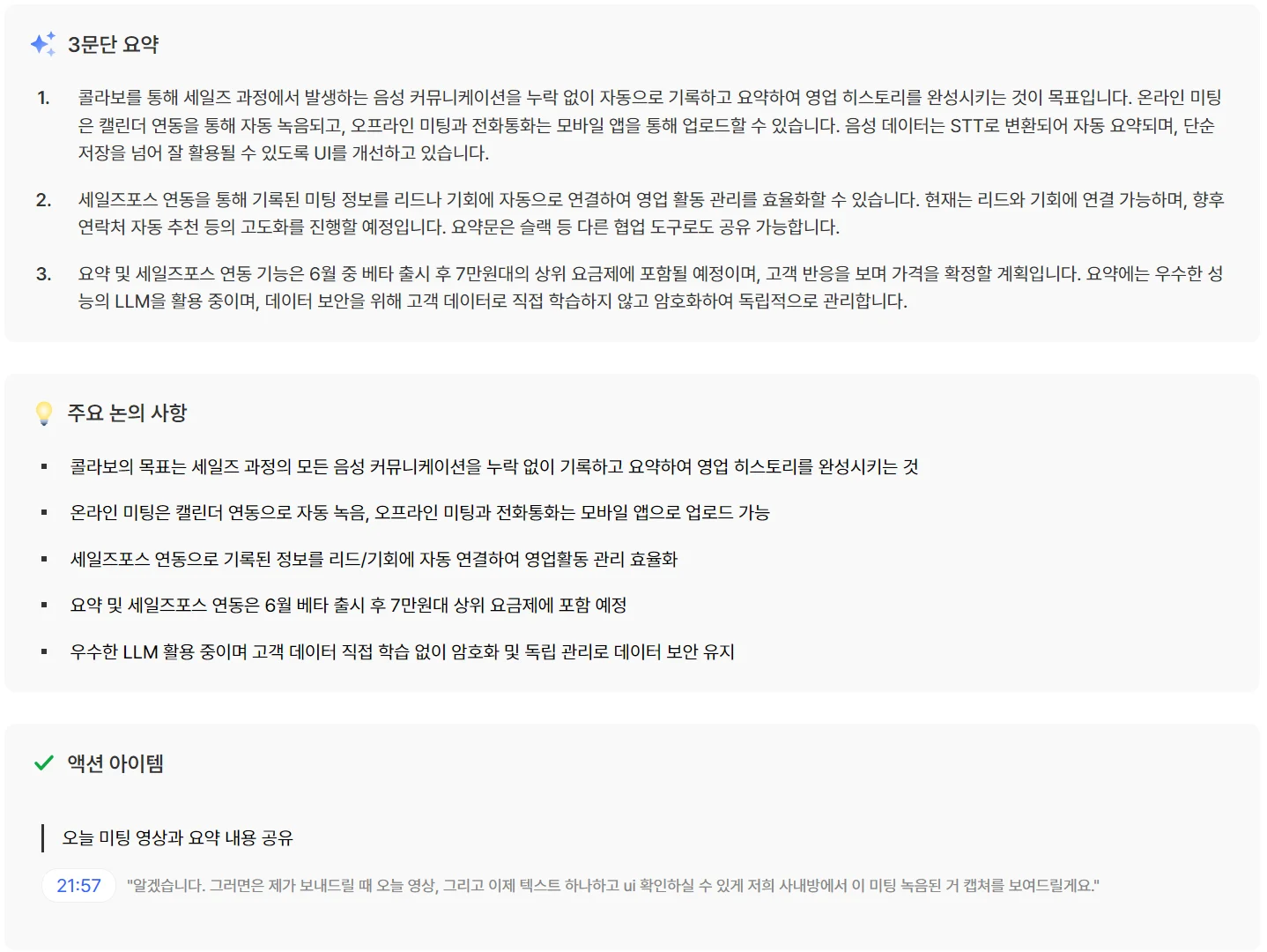 이러한 문제를 해결하기 위해 콜라보는 3문단 요약, 주요 논의 사항, 액션 아이템을 미팅이 끝나자마자 생성해주고 이를 세일즈포스, 파이프드라이브, 릴레잇 과 같은 세일즈 CRM과 연동해, 자동으로 데이터를 입력해 줍니다.